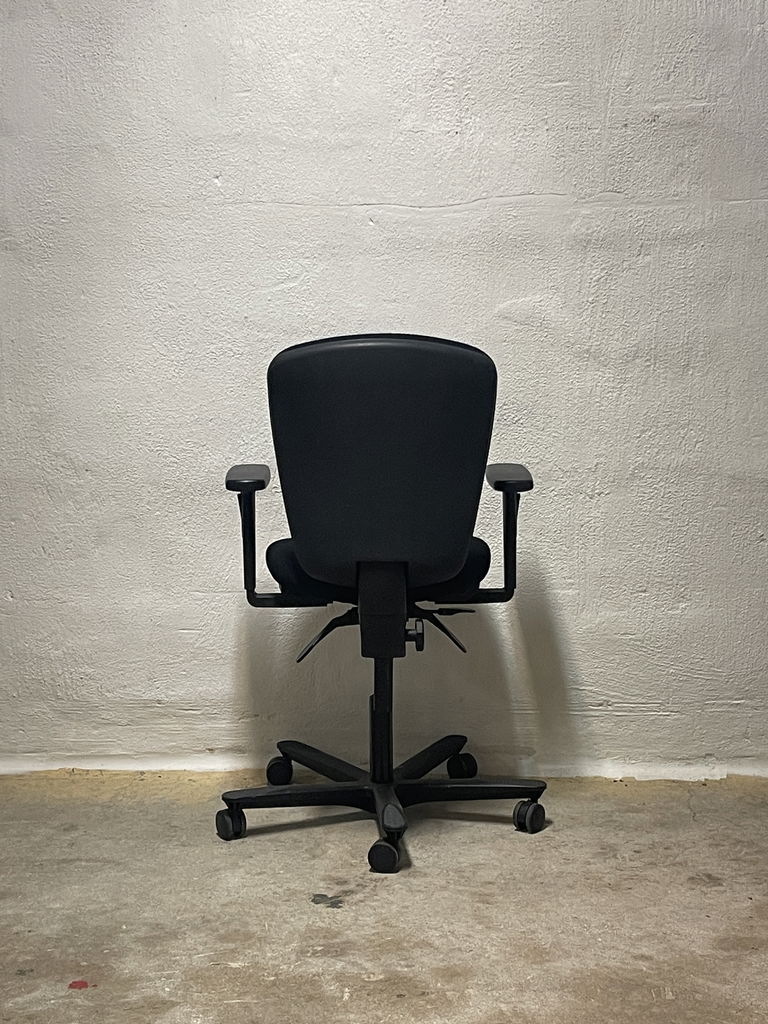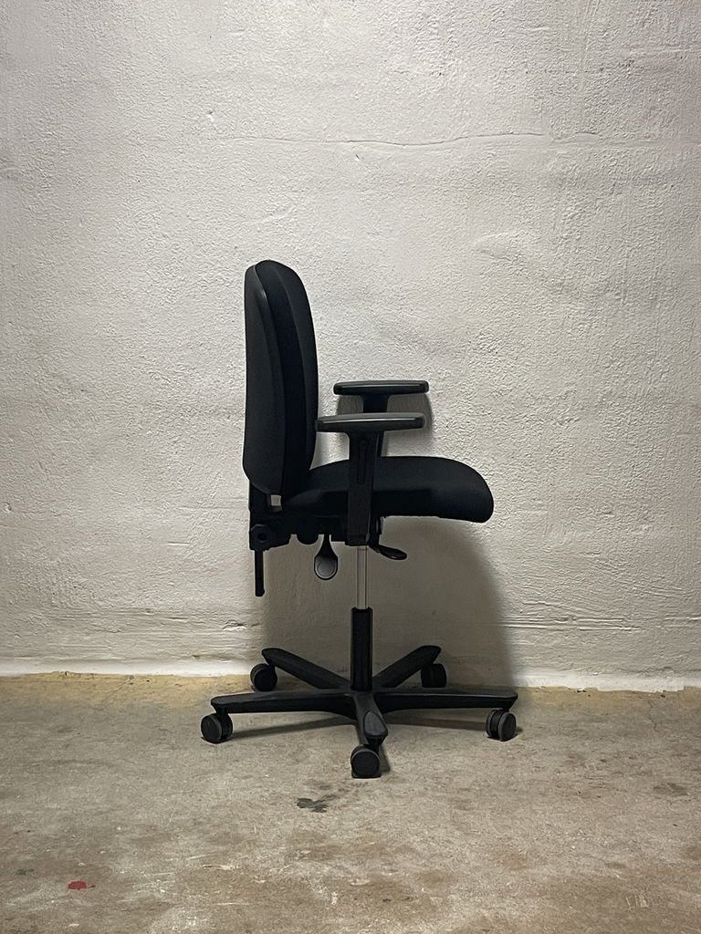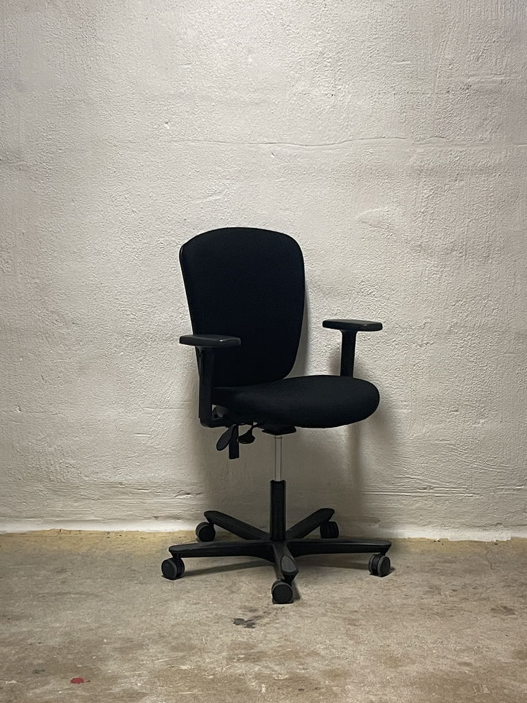 Kontorsstol från märket EFG i modellen "Teamspirit". En nätt stol med svart tygklädsel. Kan höjas och sänkas till rätt sitthöjd, släde i sitsen justerbar efter benlängd, låsbar gungfunktion med justerbart motstånd.