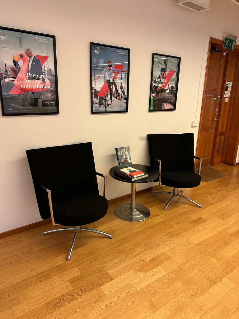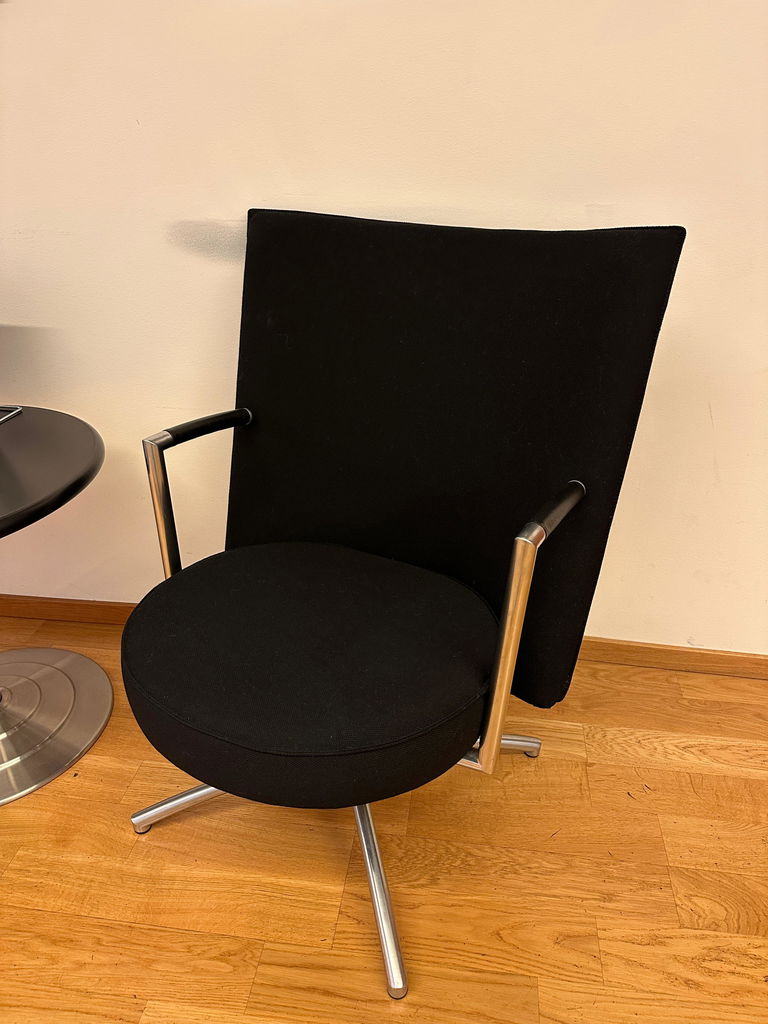 Fåtöljer från märket ERIK JøRGENSEN i modellen "70r". Fåtöljen är klädd i svart tyg med kromad fot.