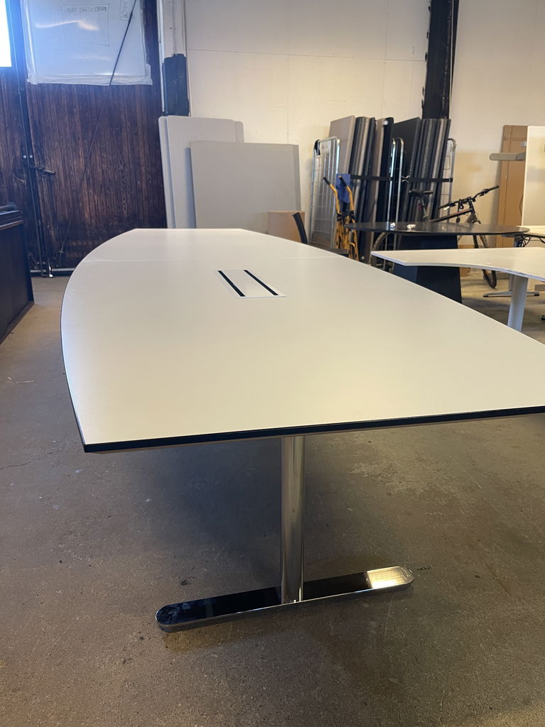 Konferensbord från märket INOFF i båtform, vit skiva och kromade ben. Bordet är utrustat med kabellucka. B: 380cm D: 120/80cm H: 74cm