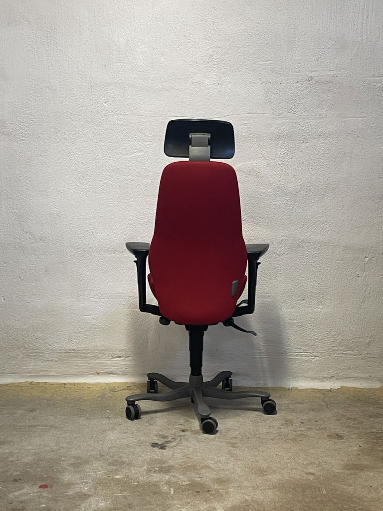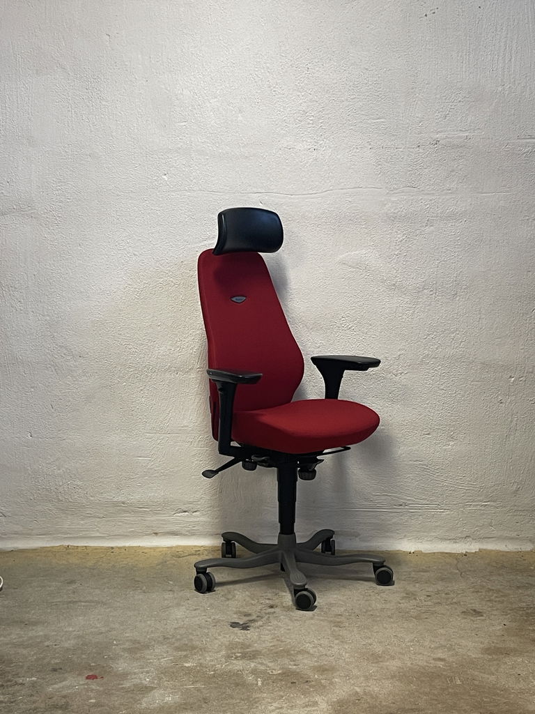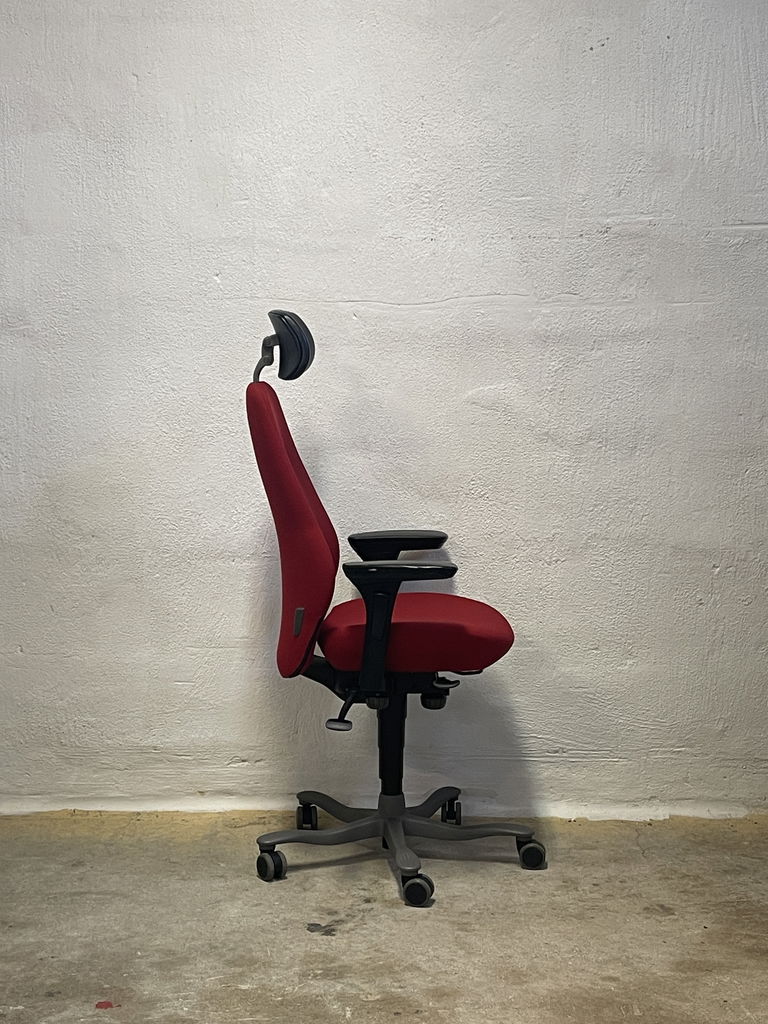 Begagnad kontorsstol från KINNARPS i modellen Plus. Stolen är i röd tygklädsel.
