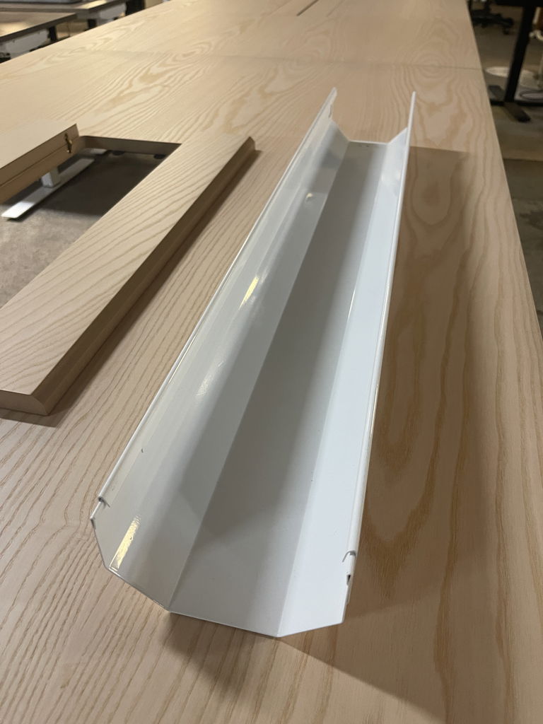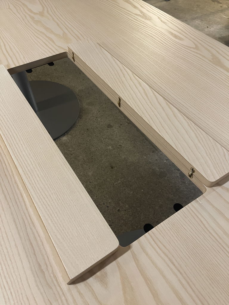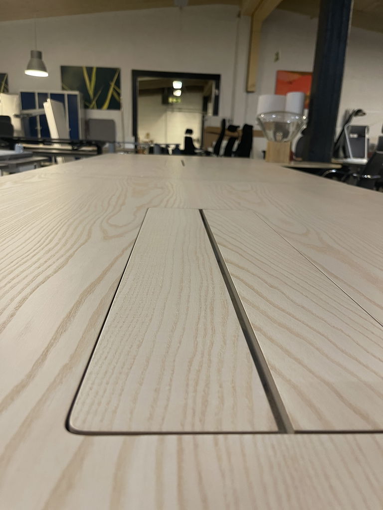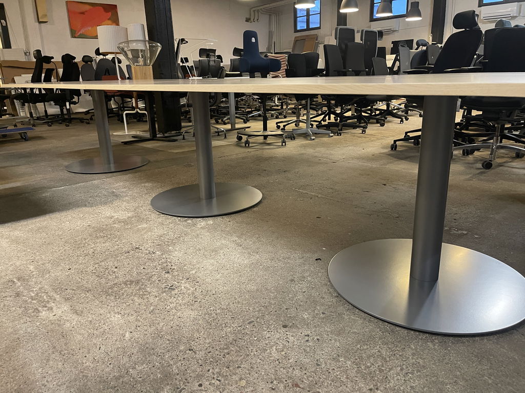 Konferensbord med silvergrå pelarstativ och skivan i askfaner. Mått: 420x124cm H75cm. Kabeldiken ingår.