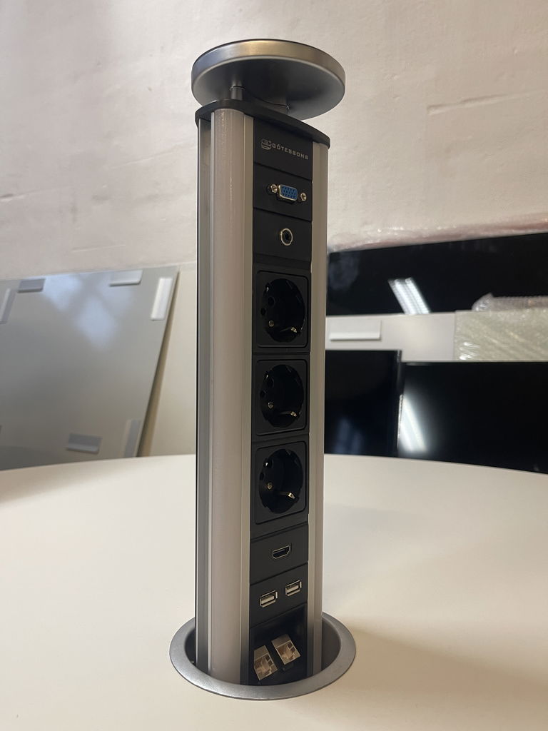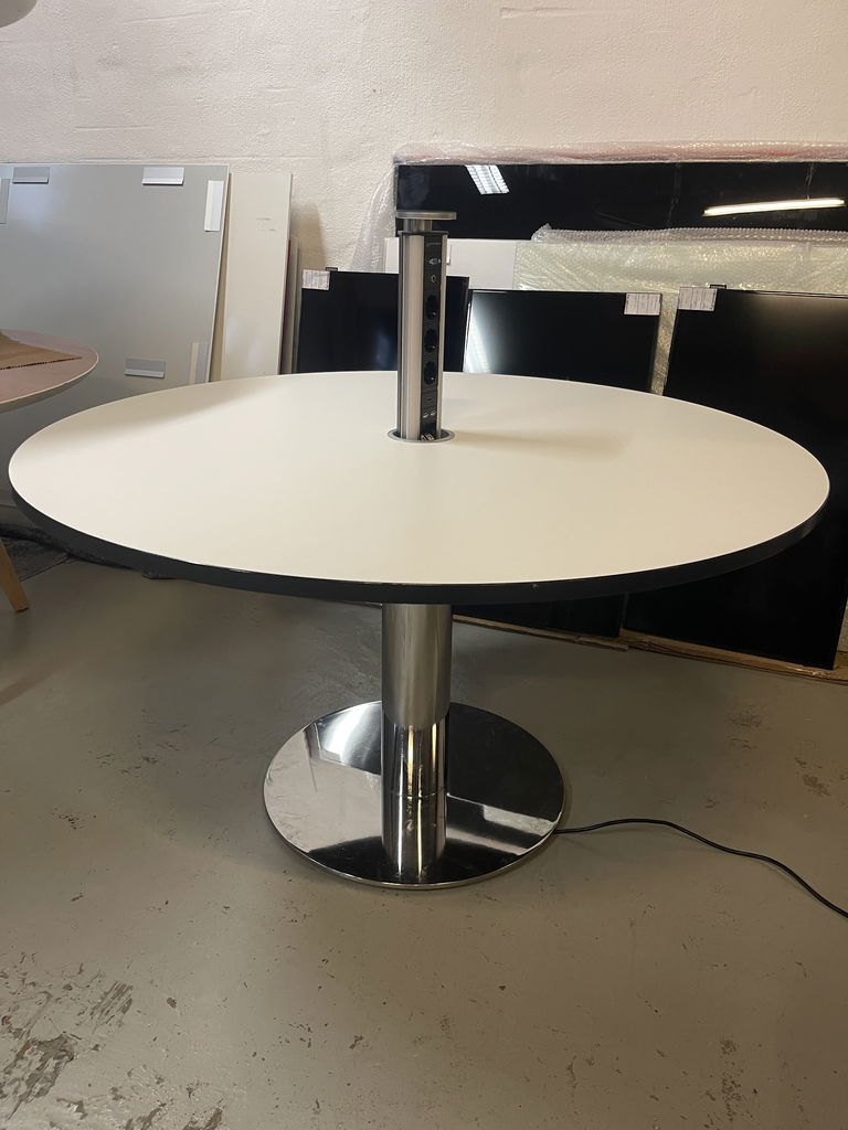 Vitt runt bord med kromstativ med eluttag. Ø127cm H72,5cm