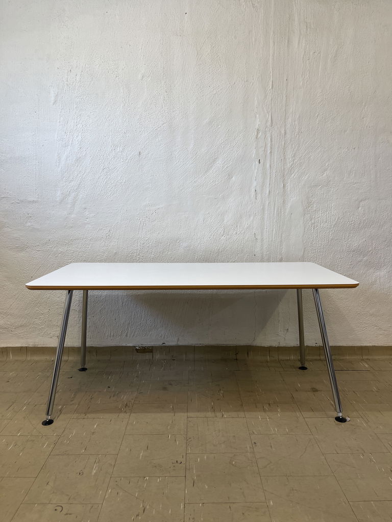 Begagnat konferensbord från märket SKANDIFORM med vit laminatskiva med ek kant och kromade fötter.