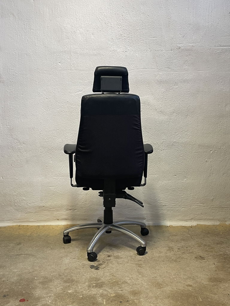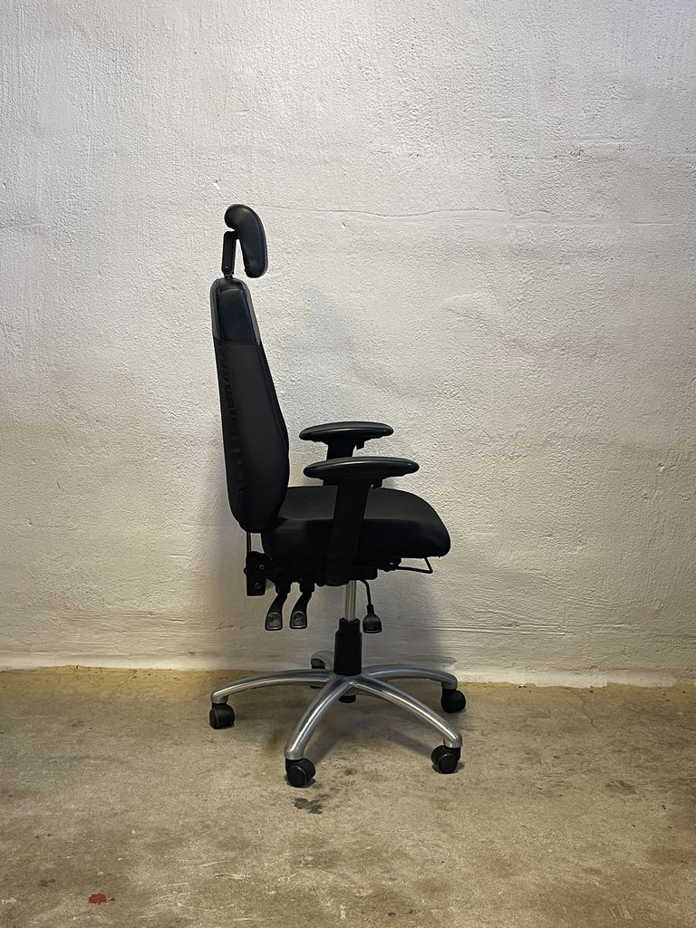 Begagnad kontorsstol från märket TOPLUX i modell Optimum N i svart tyg, tyget är något ljusare än skinndetaljerna. En kontorsstol som blandar både snygg design med god ergonomi.