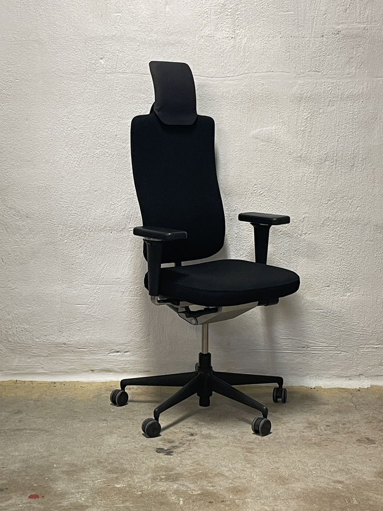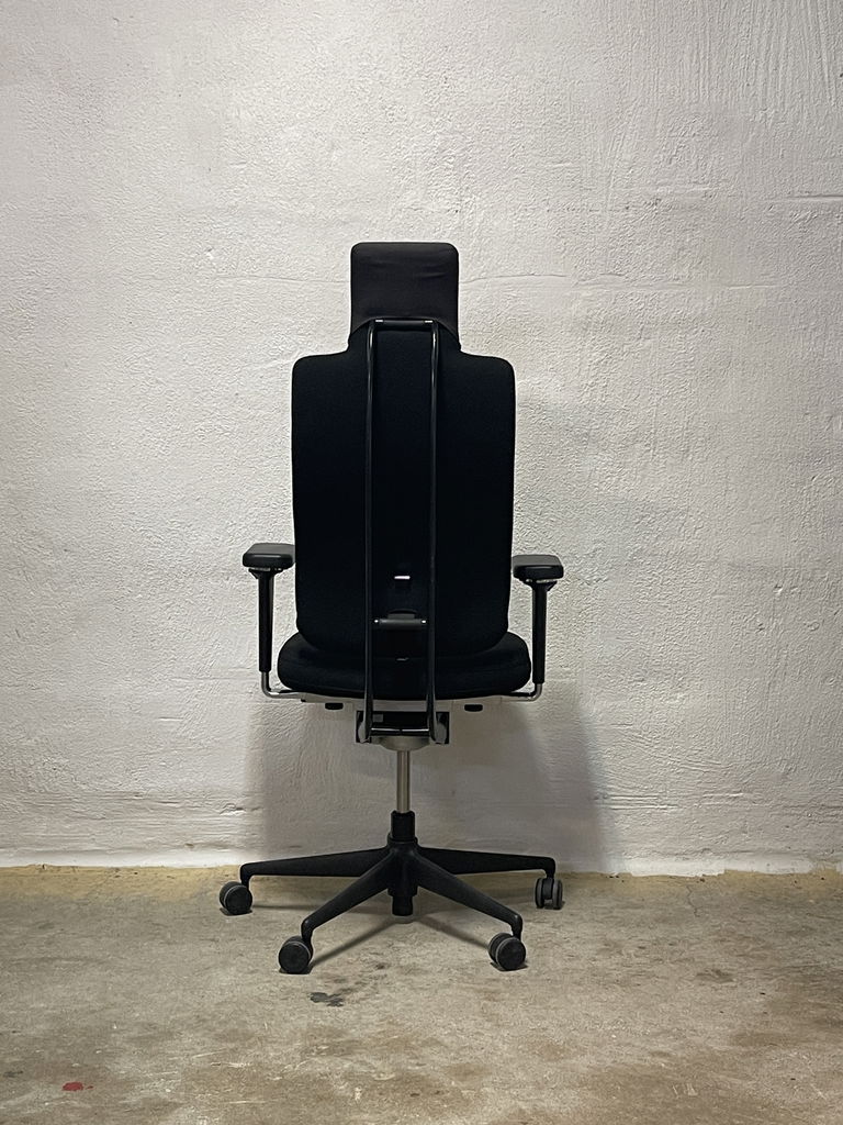 Begagnad kontorsstol från märket VITRA i modellen Headline. Klädd i svart tyg med tyg nackstöd samt svart fotkryss.